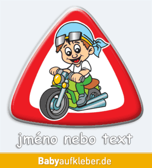 Der 3D-Aufkleber Junge auf Motorrad wird in Farbe gedruckt, auf seine Oberfläche wird eine transparente 3D-Schicht aufgebracht. Fügen Sie den Namen Ihres Kindes oder einen Text mit bis zu 30 Zeichen auf dem Aufkleber hinzu beliebigen Farbe aus dem Sortiment hinzu. Die Abmessungen sind festgelegt, die Mindestgröße beträgt 8,8×8 cm, Katalognummer 9372. 3D Autoaufkleber mit Namen - Junge auf Motorrad kann andere Fahrer vor einem Kind im Auto warnen.