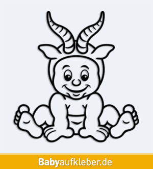 Einen Autoaufkleber Junge im Tierkreiszeichen Steinbock bieten wir in 24 Farben an und ergänzen ihn mit dem Namen eines Kindes oder mit einem Text in einer Länge von bis zu 30 Zeichen. Die Mindestmaße eines Aufklebers sind 9.5×10 cm, Katalognummer 22206. Autoaufkleber mit Kindernamen - Junge im Tierkreiszeichen Steinbock Ein Autoaufkleber mit dem Namen eines Kindes - Kopf eines Jungen weist die anderen Fahrer auf ein befördertes Kind im Auto hin.